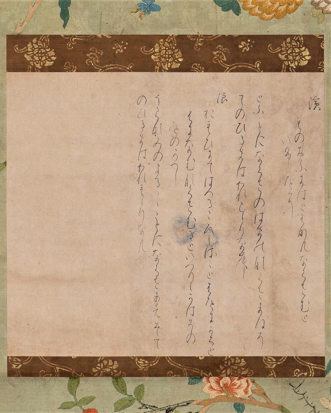 이것은 藤原定信(ふじわらのさだのぶ)가 25~26세 즈음에 쓴 글씨로 추측됩니다. (伝이 아니야!) 두번째 줄 세번째 글자의 し를 그.. 붓의 방향은 바꾸지 않고 힘의 강약만을 조절해서 표현한 것이 무척이나.. 터프하다고 해야할까요.. 하하. 종이에는 초록빛으로 색을 입히고 금은박으로 새나 나뭇가지 등을 표현한 것이 글씨와도 무척이나 조화롭습니다.