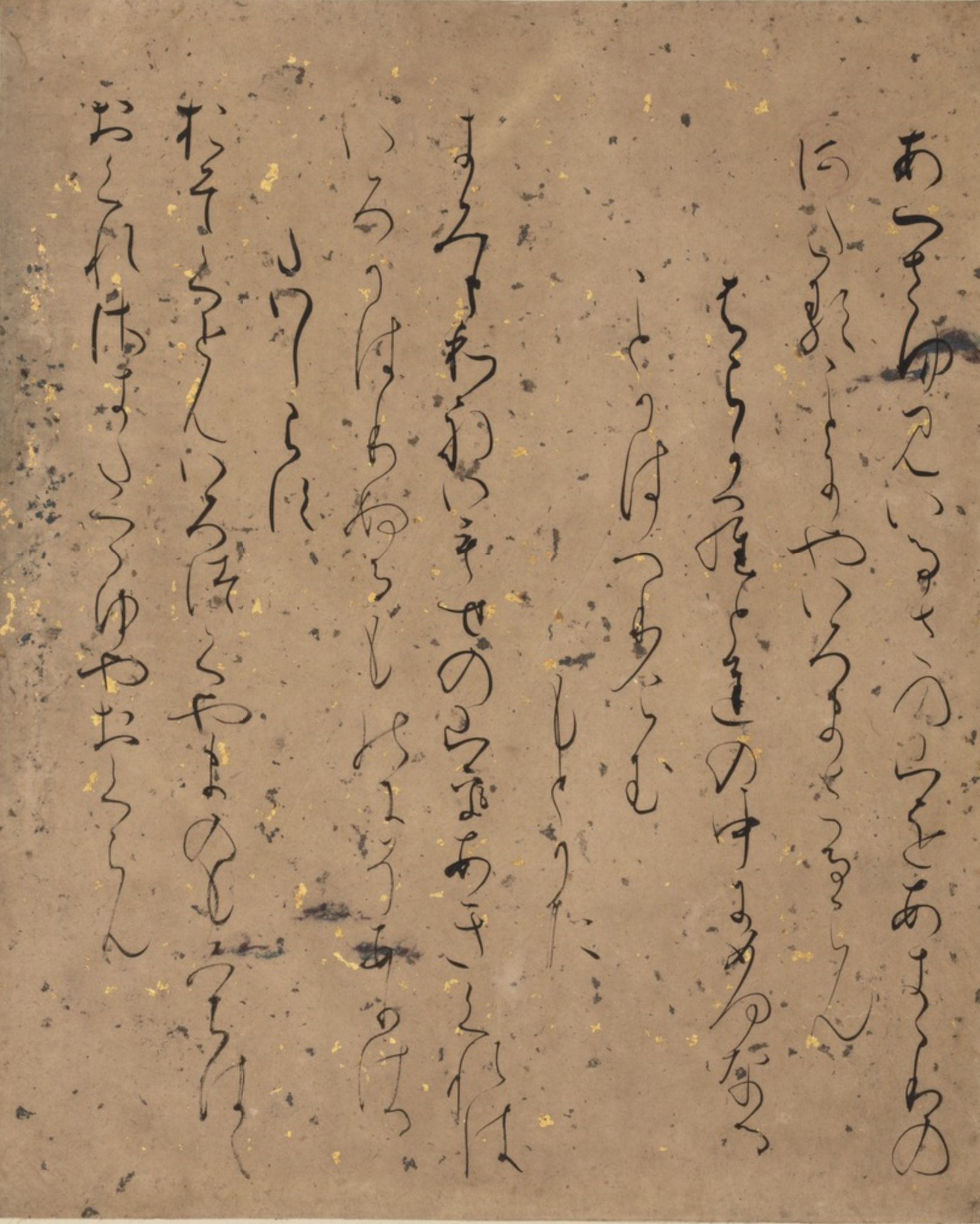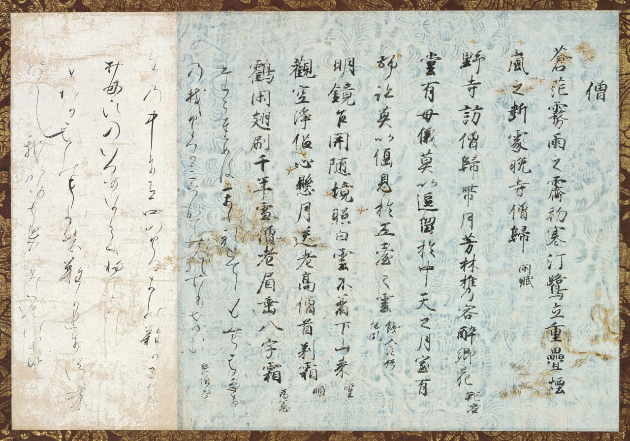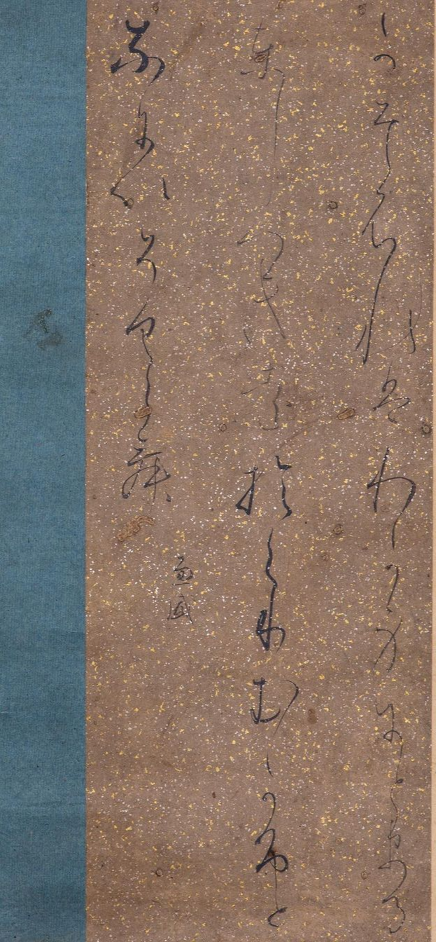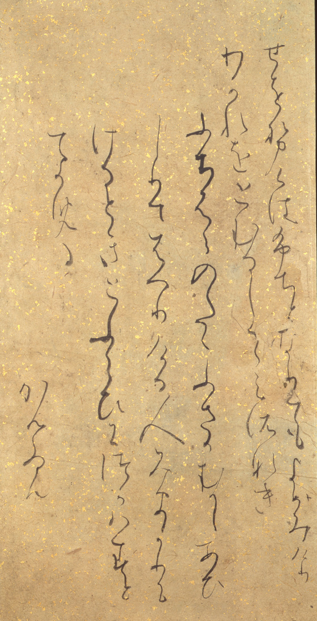 특히 붓끝을 강하게 종이에 내리 꽂는듯한 독특한 중량감이 느껴지죠. 물론 동시에, 선의 시작과 끝부분이 뭉개지지 않고 날카롭게 살아 있는 것도 그의 특징입니다. 취향이냐고 하면 그건 아니겠지만(?) 아무튼 독특하고 재미있어요. 12세기 중반의 이 작품 즈음부터 금은박으로 霞引き, 즉 안개처럼 표현한 장식이 본격적으로 서예용 종이의 장식으로 정착해갑니다. 이것도 직접 보면 정말 아름답고, 글씨의 밸런스를 해치지 않는 수준에서 은은하게 화려해서 좋아해요.