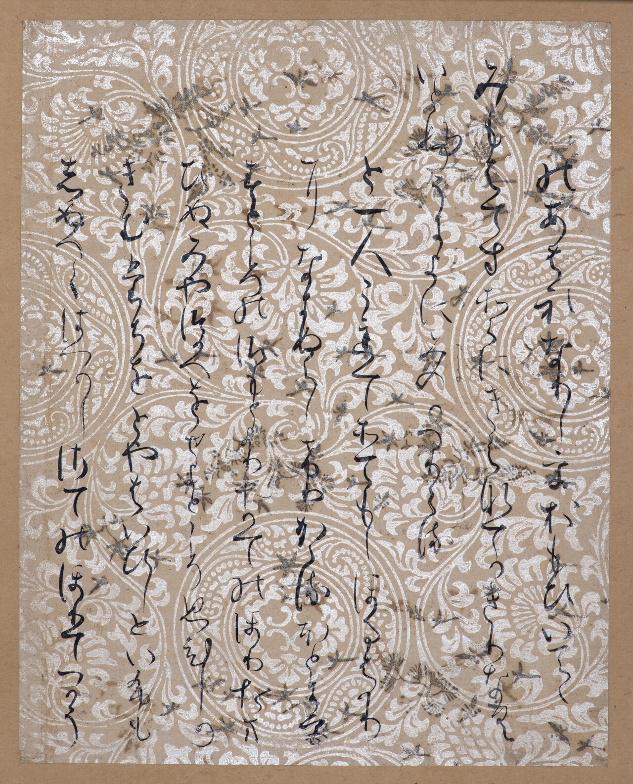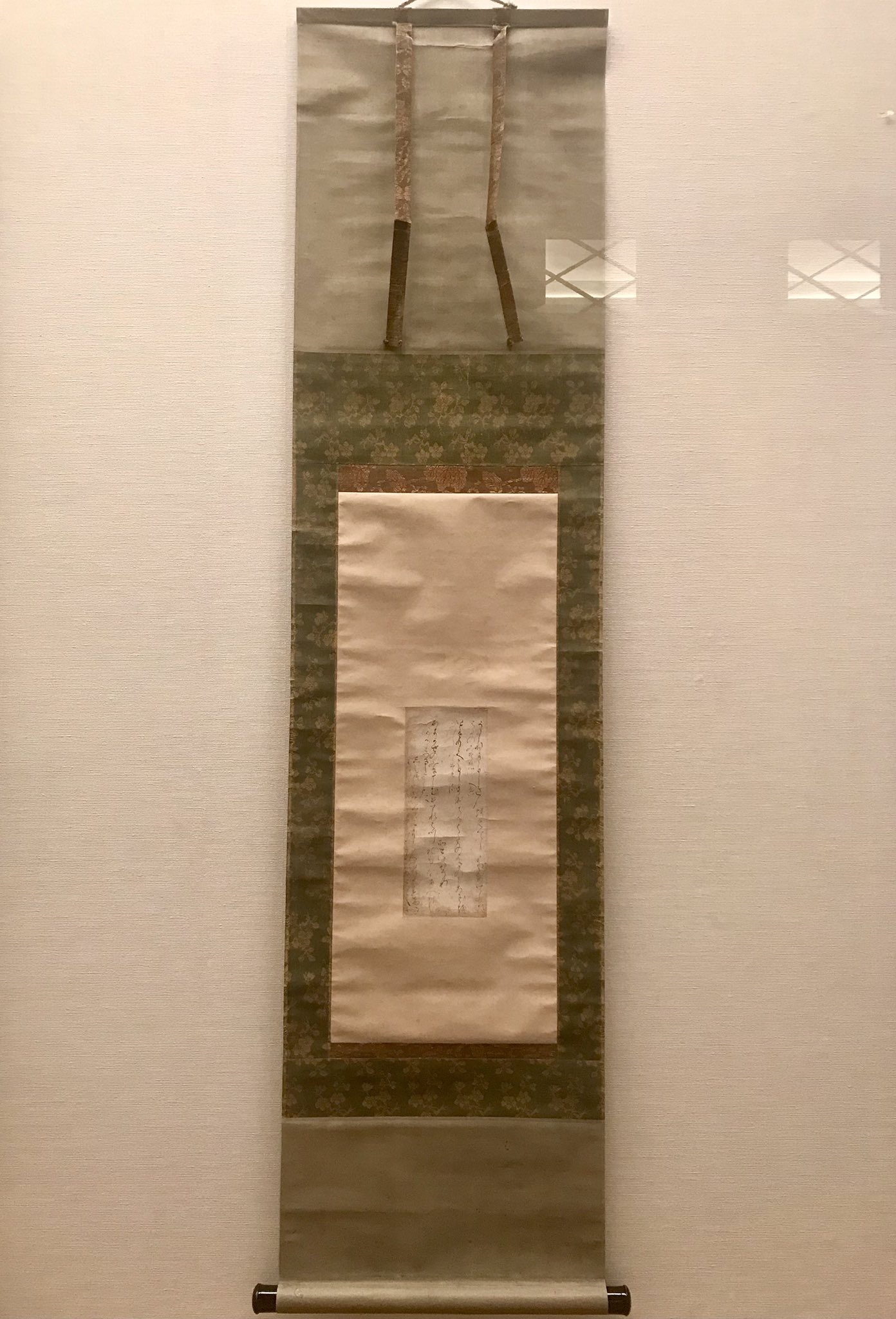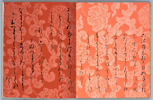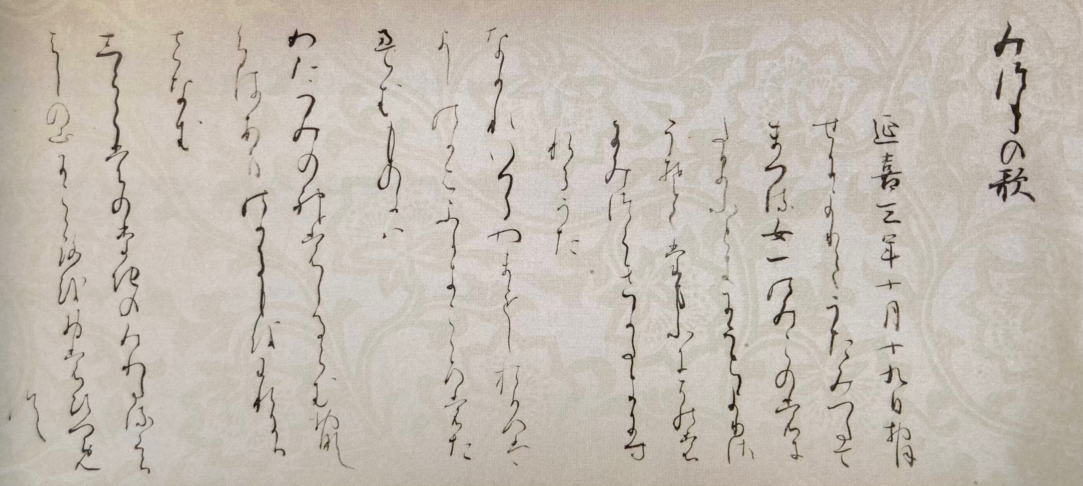 이것도 도록을 찍어왔습니다 휴.. 연한 갈색의 종이에 雲母摺り로 문양을 찍어냈습니다. 굉장히 익숙한 서풍이라, 이것도 定実의 글씨인가? 생각했는데 실제로 元永本 등과 가까워 사다자네의 글씨로 추측하고 있다고 합니다. 우하하. 이제 제법 친해졌어(?)
