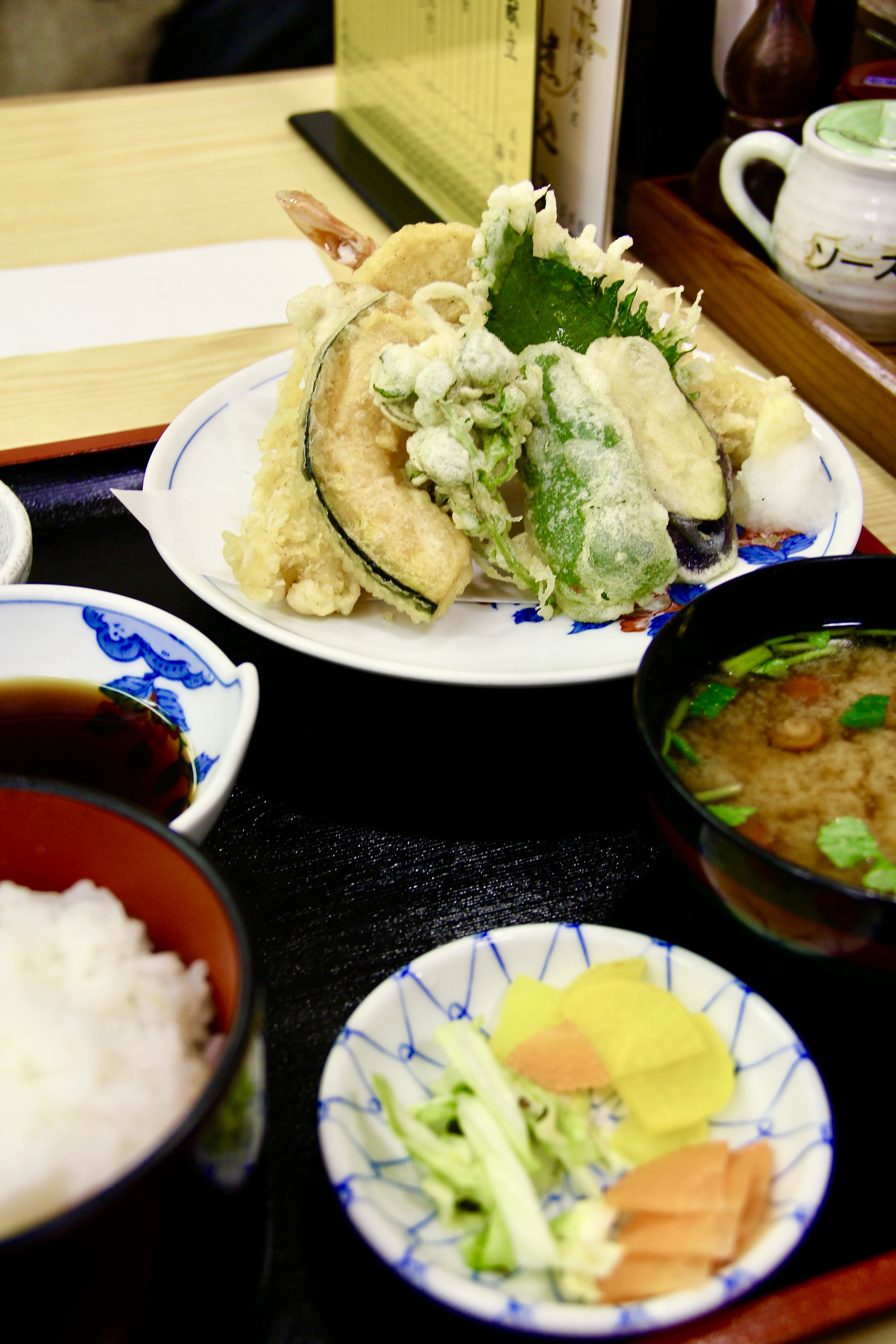 튀김 정식이 먹고 싶었는데, 진짜로 미술관 바로 앞에 있던 가게에서는 3,500엔인가.. 그런 가격이길래 10분 쯤이야 걸어도 되지.. 하고 내려왔는데 산길이 제법 힘들었고요.. 대충 보이는 가게에 들어가서 튀김 정식을 주문했습니다. 1,600엔이었는데 평소 같았으면 이것도 좀 비싼데? 생각했겠지만.. 3,500엔이라는 가격을 보고 나니 천사더라고요 어흑흑.. 자리는 여유로웠고 엄청 나빴냐면 그렇진 않았지만.. 밥은 좀 질었고 튀김도 약간 온도가 안 맞았고 어쩌고... 아니 그래도 맛있게 먹긴 했어요 하하