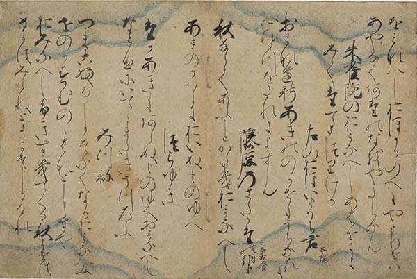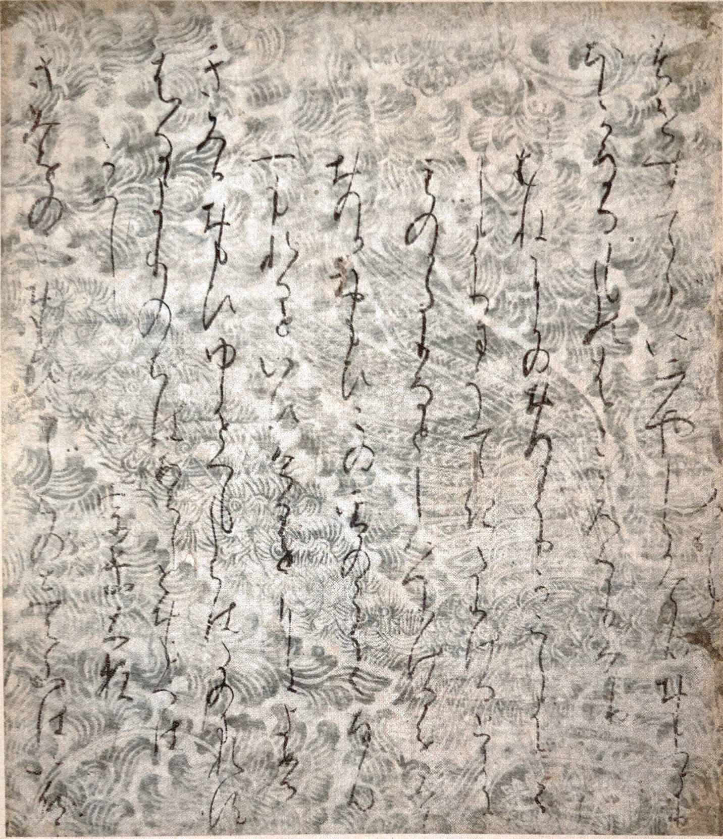 고토미술관에서 소장하고 계신 페이지 사진을 주워왔어요.. 문양은 전체적으로 크게 들어갔으나 조금 흐릿하죠. 앞에서 소개한 伝藤原公任의 太田切와는 또 전혀 다른 글씨체인데, 하고 생각했는데 실제로는 行成의 손자인 藤原伊房의 작품으로 추측되며, 마찬가지로 11세기 후반에 만들어진 작품으로 보는 것이 타당하다고 합니다.