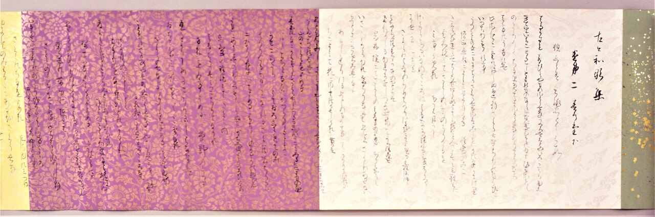 아름다운 글씨입니다. 드디어 디지털 자료가 있었어요 흑흑.. 전체에 雲母摺り로 찍어낸 문양화, 거기에 더해 그려낸 그림도 무척이나 아름답습니다. 이 즈음에는 일본 내에서 唐紙를 제작하는 수준이 이미 높아져 있었다고 합니다. 이 또한 伝藤原公任로 적혀있는 것 치고는.. 제법 또 분위기가 다르죠..? 関戸本과 공통되는 부분이 있다고 합니다.