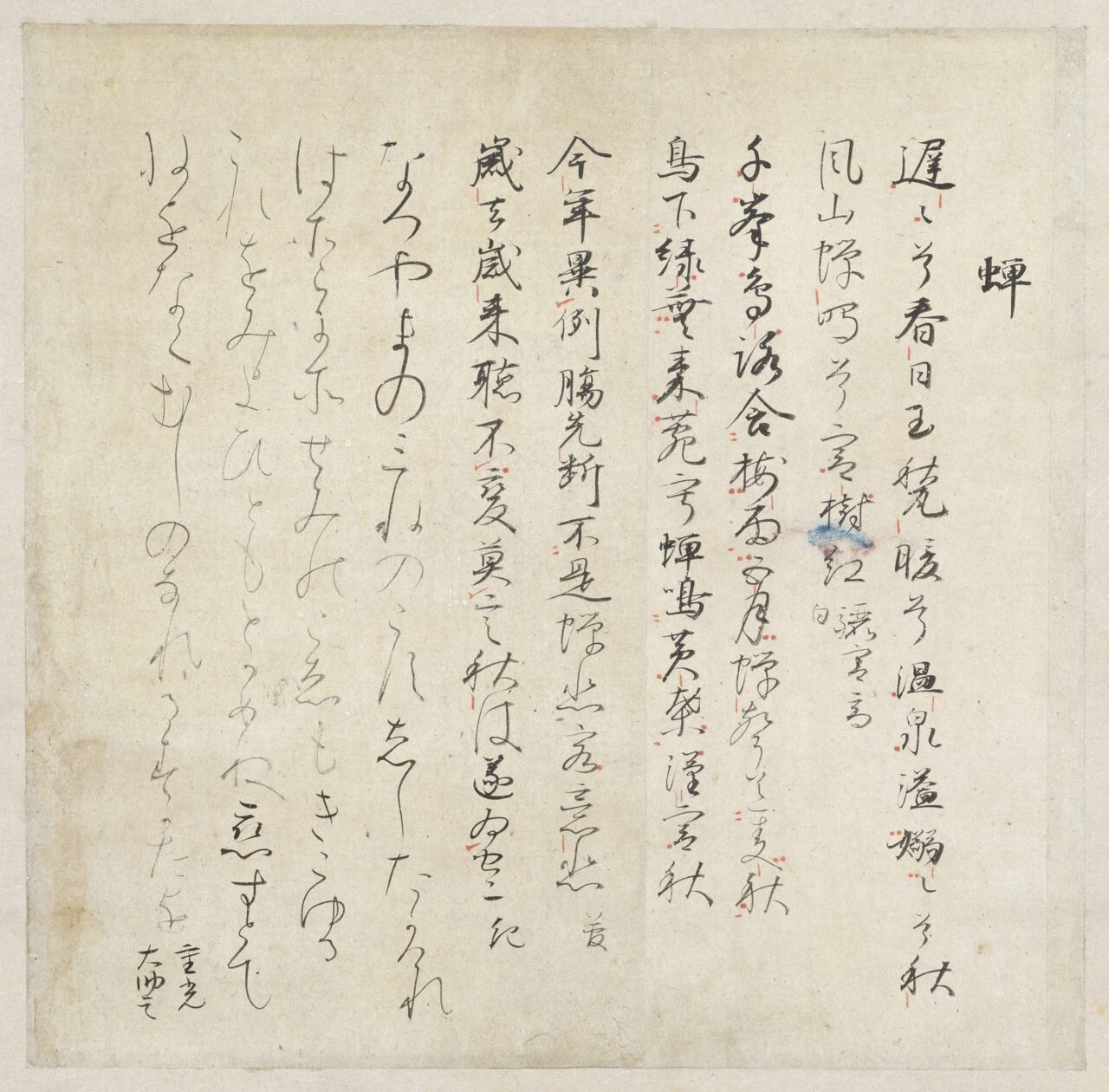두번째 줄 첫번째 글자인 か와 세번째 글자인 か(可)가 각각 다른 두가지 형태로 연달아 나오는게 무척이나 흥미롭습니다. 주제가 風인가? 했는데, 지금 찾아보니 '가을上'에 수록된 170번과 171번 시를 적은 페이지 같군요 헤헤.