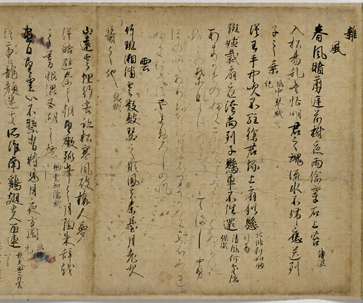 이것과 비교해보면, 앞에서 소개한 和漢朗詠集切는, かな표현에서 주로 나타나던 방식을 한자 서예에도 반영한 사례라고 볼 수 있습니다. 동시에, 대조적으로 かな인 和歌 부분은 세밀한 붓으로 바꾸어 썼죠. 물론 후자의 표현법은 이전의 작품들에도 있어왔던 방식인데, 전자의 표현법은 확실히 조금 더 이후 시대의 표현법이겠구나, 하는 추측이 가능해서 무척이나 흥미롭습니다.