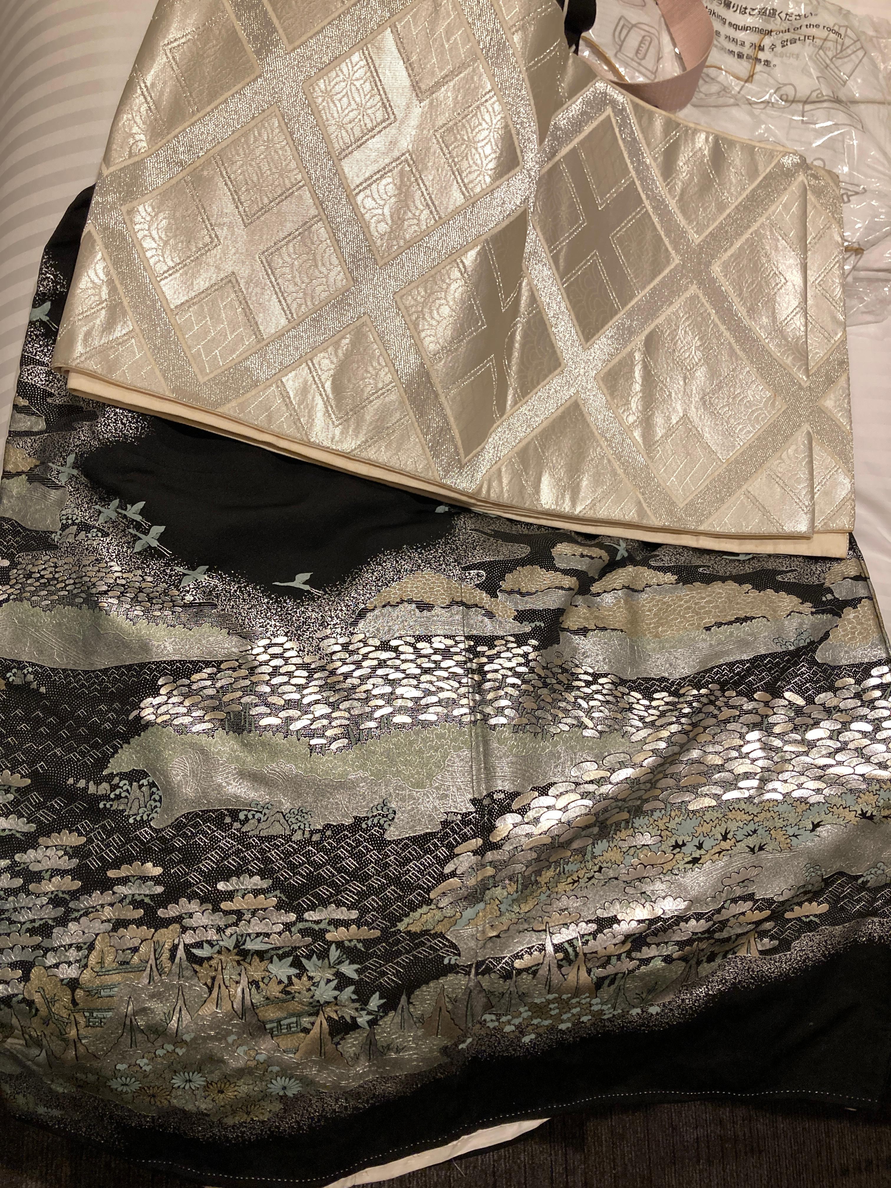 이건 호텔에 돌아가서 찍은 사진이지만, 전체가 검정색인데에 밑단에 저렇게 금은빛으로 빛나는 무늬가 아주 아름답고 화려하게 들어가 있는 기모노였습니다.. 하하. 가게 주인분이 처음에 갔을때도 그거 치마로 만들면 예쁘겠지? 하시더니 다시 갔을때도 그것봐, 내가 말했잖아ㅎㅎ 하시더라고요.. 근데 팔 길이는 짧았어요 힝.. 이거 저한테 짧겠죠? 하니까 그건 너무 욕심이 과하다~~ 옛날엔 평균 키가 155였다구~? 하시더라고요ㅎ 그리고 위쪽에 찍힌 띠가 시착 당한 가게에서 산것! 이것도 아주 반짝반짝 번쩍번쩍 너무 아름답죠...