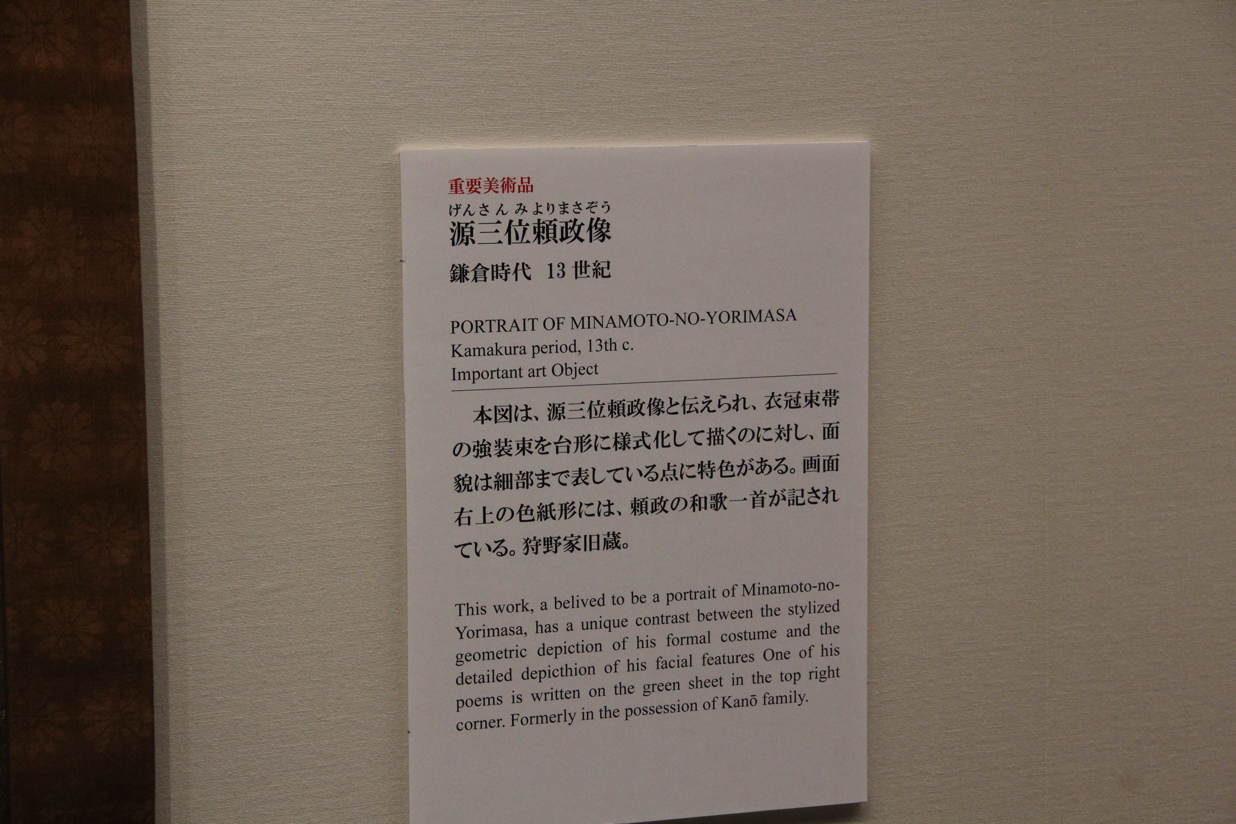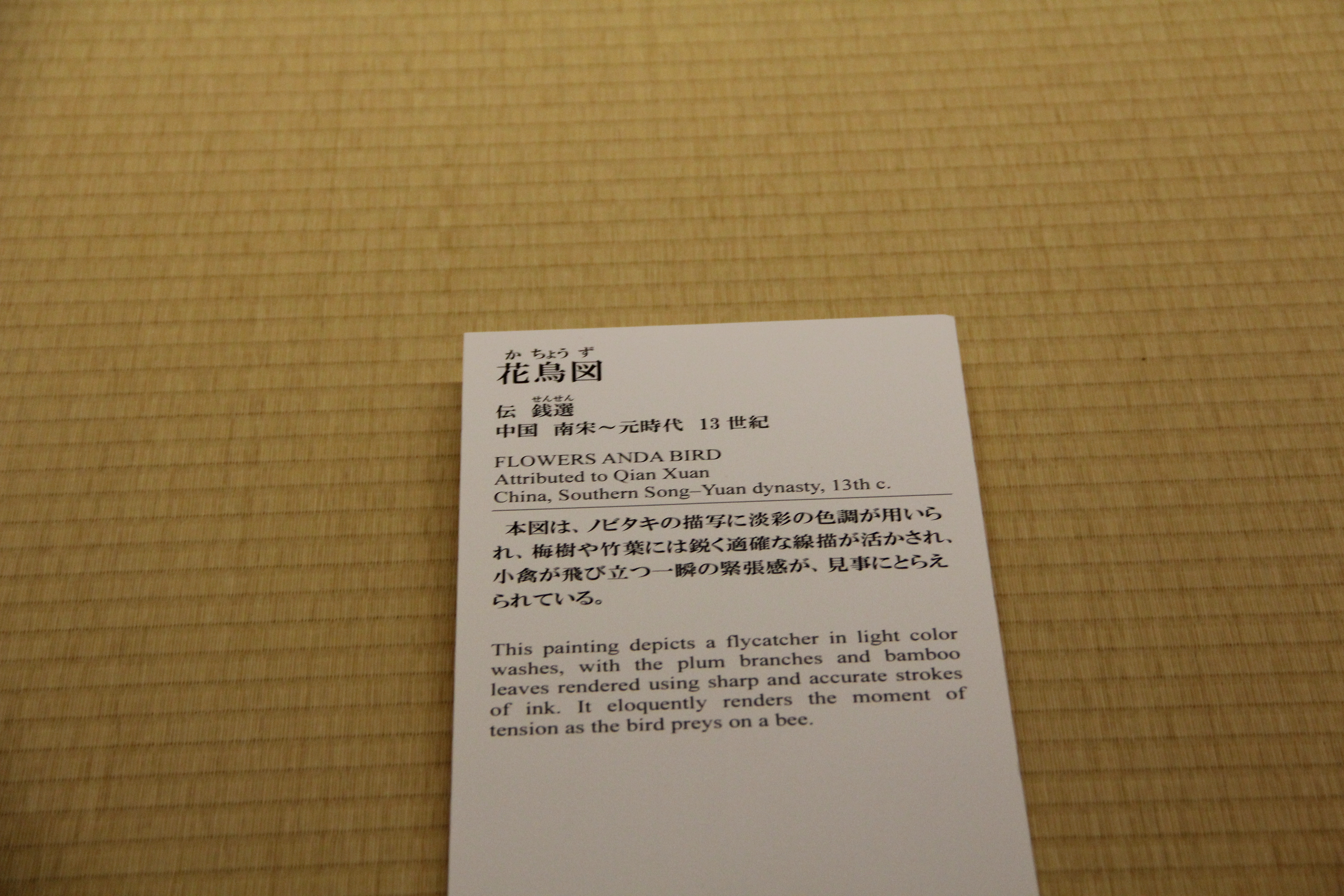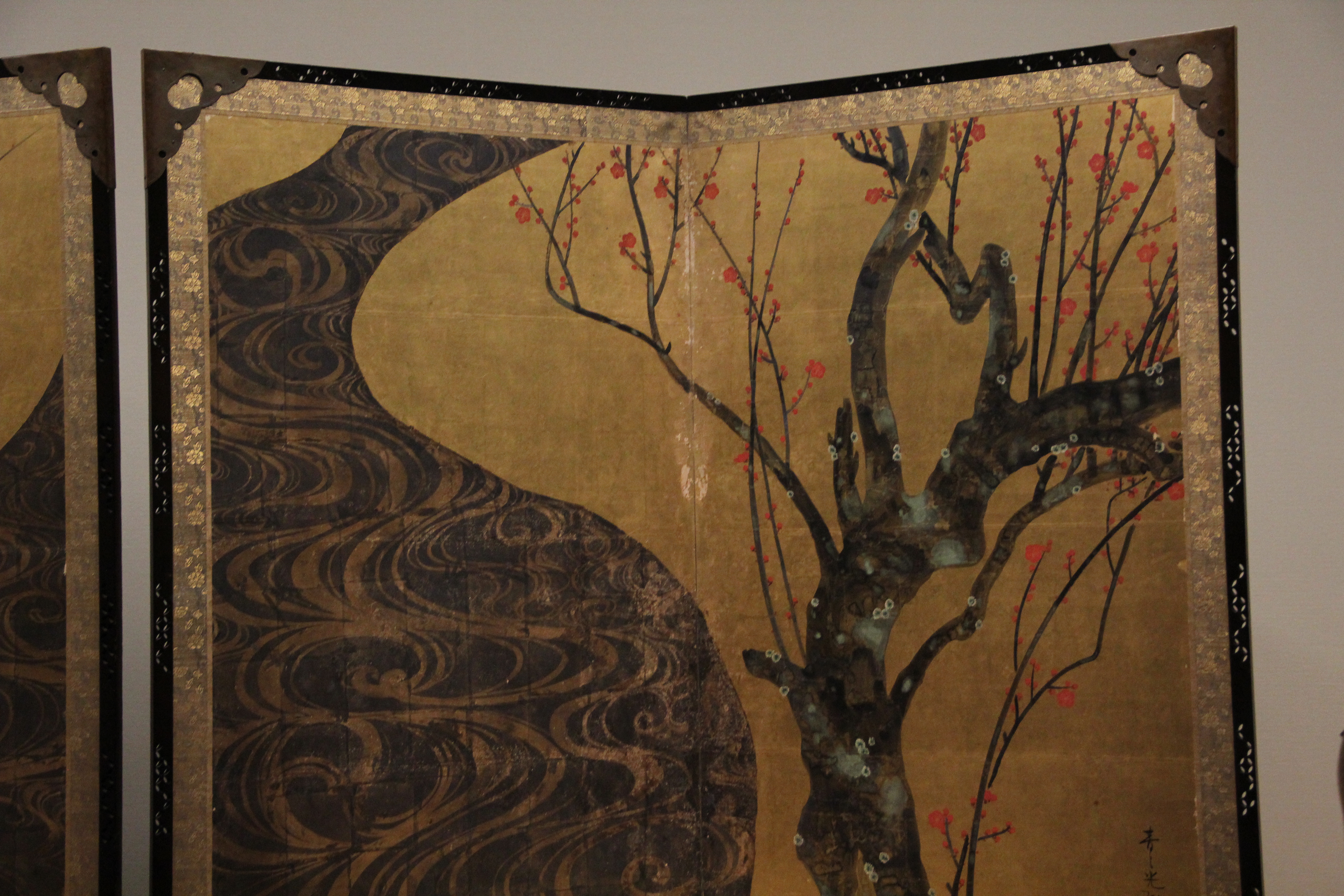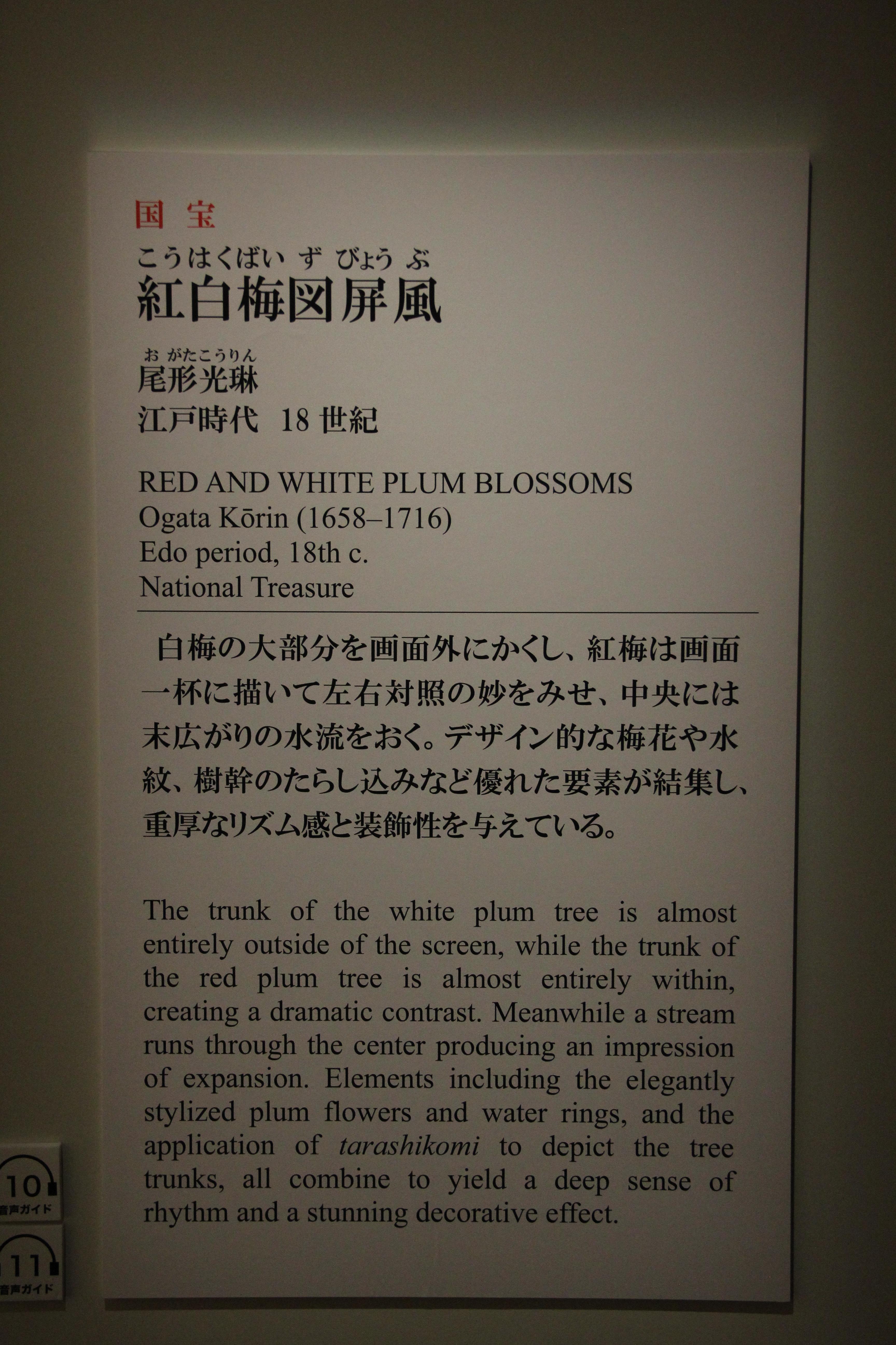 그리고 이것이 두번째 국보 작품, 에도시대 18세기의 紅白梅図屏風입니다. 이 미술관의 가장 대표적인 작품이기도 합니다. 좌우, 두 폭으로 이루어져 한쪽은 하얀 매화가 다른 한쪽은 붉은 매화가 그려져있습니다. 이러한 대표적 작품은, 인터넷 상에서 이미지도 쉽게 찾아볼 수 있기는 하지만, 역시 직접 보았을때의 압도되는 분위기는 절대 못 따라오는것 같아요. 이곳저곳 구석구석 들여다볼수도 있고, 붓의 터치 하나하나를 느껴볼 수도 있고요.