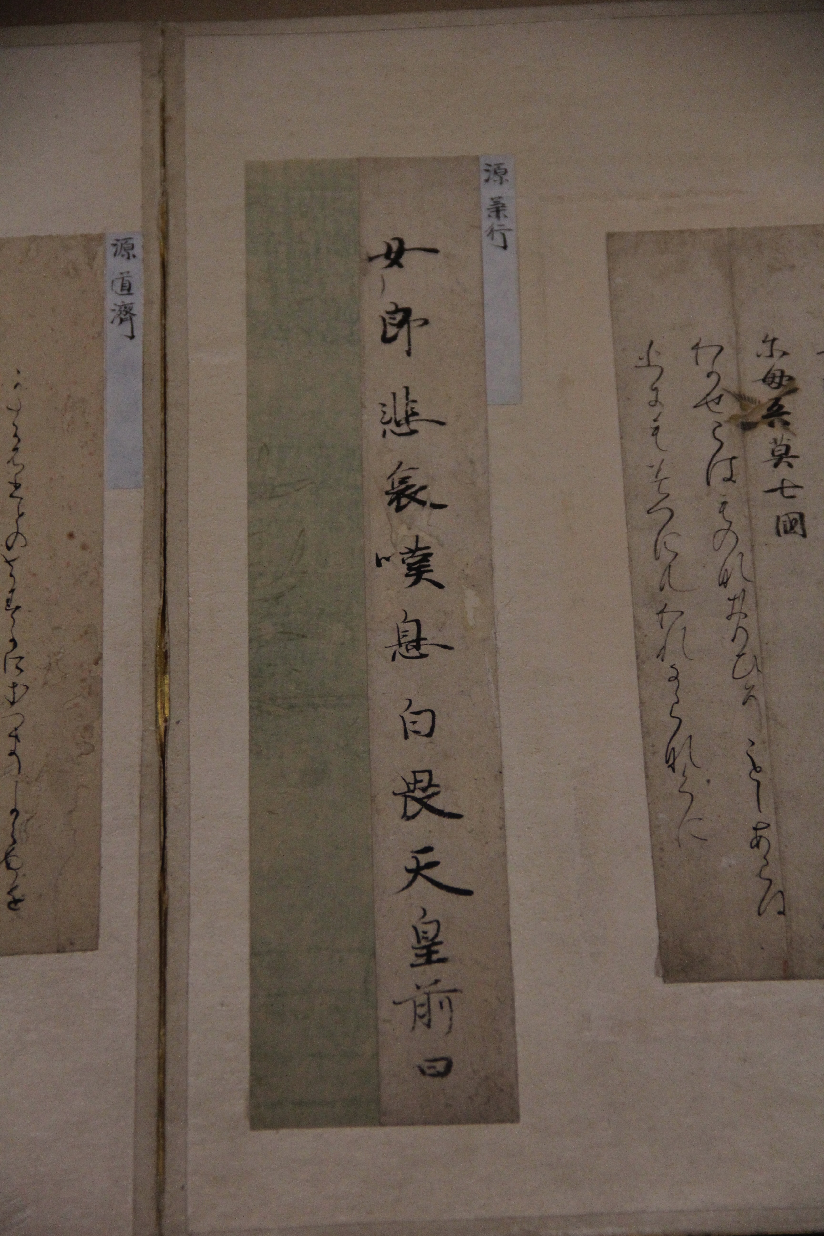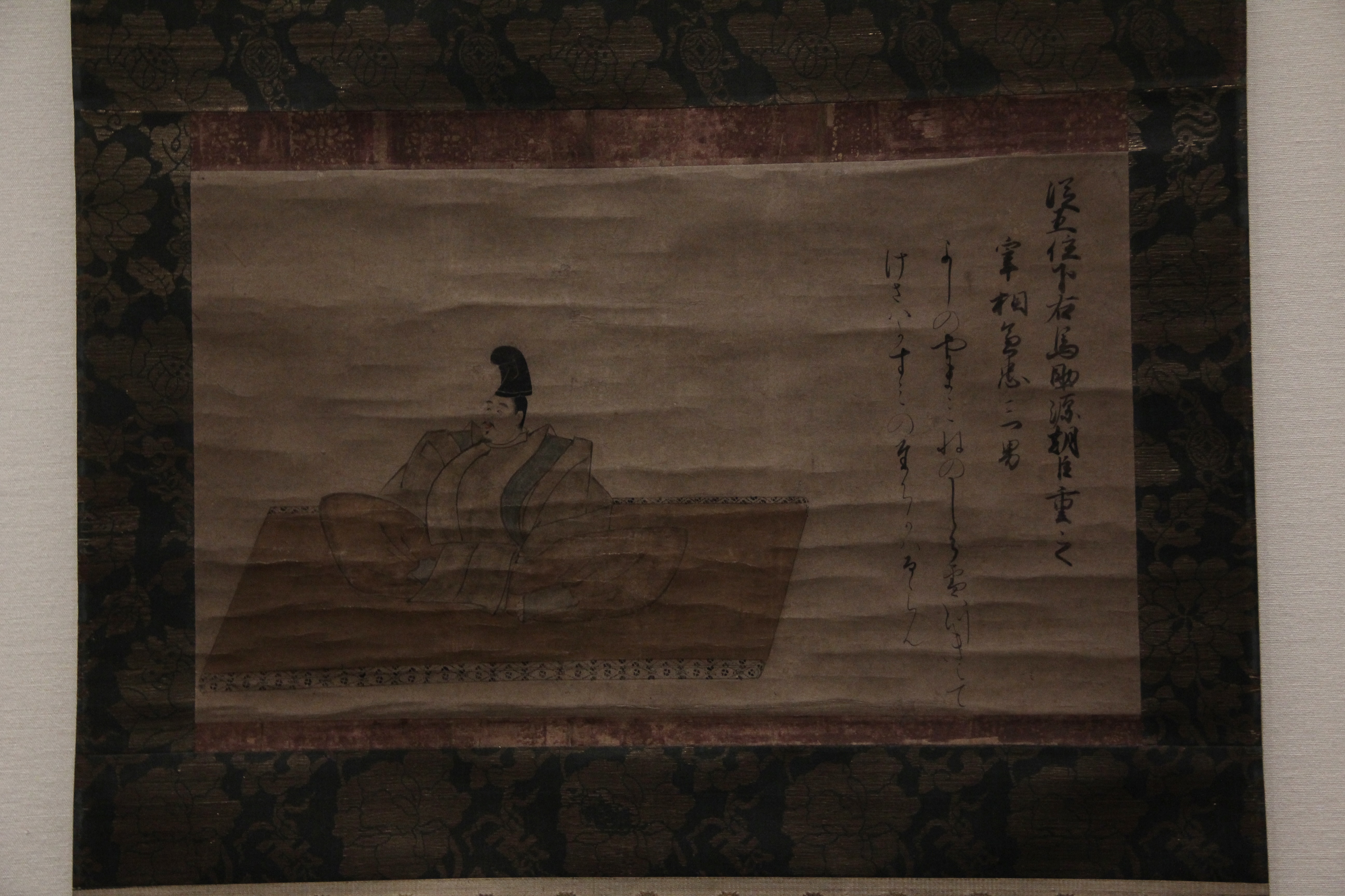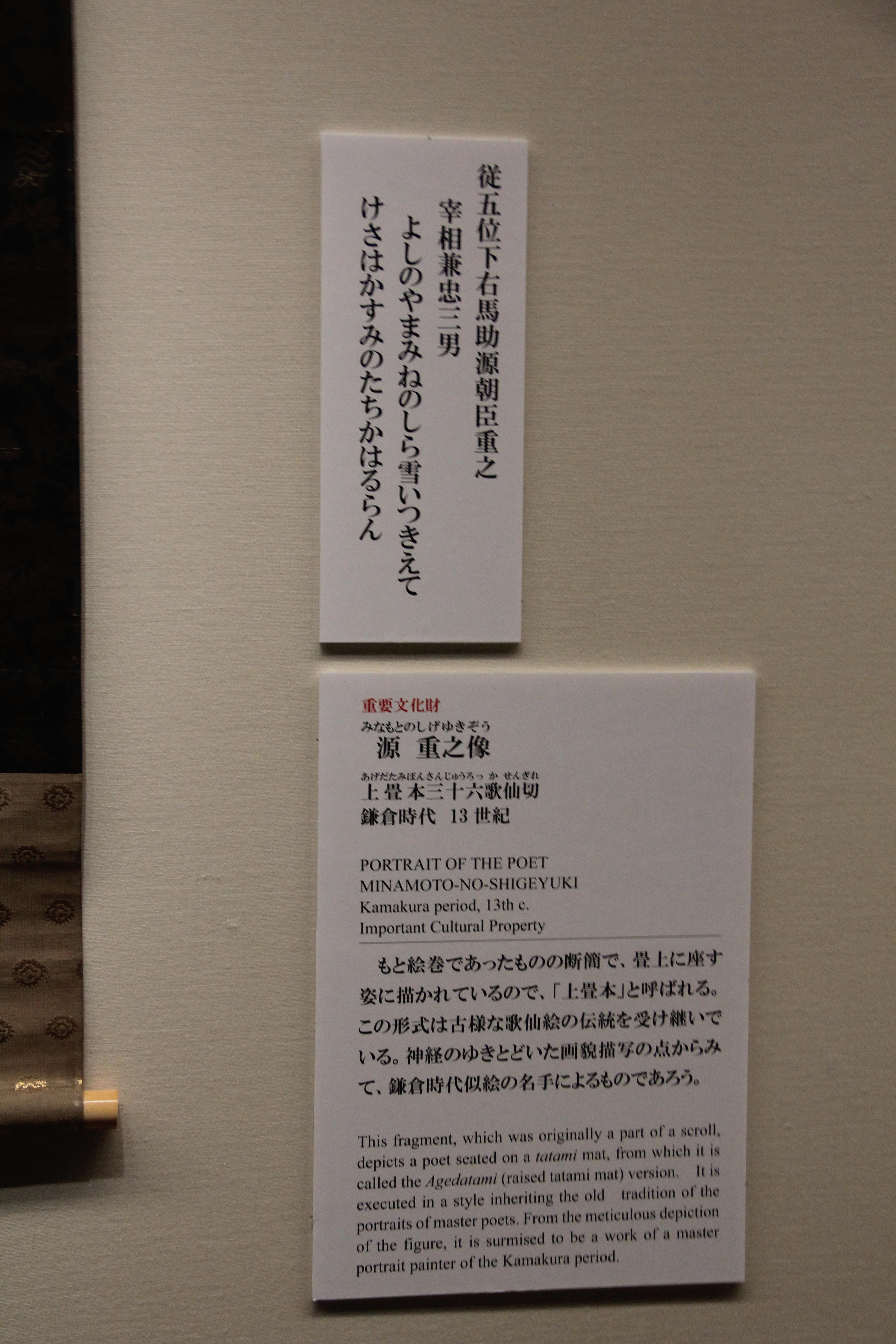 가마쿠라 시대의 源三位頼政像입니다. 이건 글씨가 너무 흐려서 제대로 읽지는 못했는데, 한 폭 위에 色紙처럼 다른 종이를 덧대어 붙인건지 그려넣은건지? 아무튼 그런식으로 표현한게 제법 재미있더라고요. 종이의 색을 약간 다르게 하여 정사각형에 가까운 모양새로 두 장을 나란히 배치하고, 거기에 散らし書き로 시를 표현한게요. (무인들주제에ㅎ)