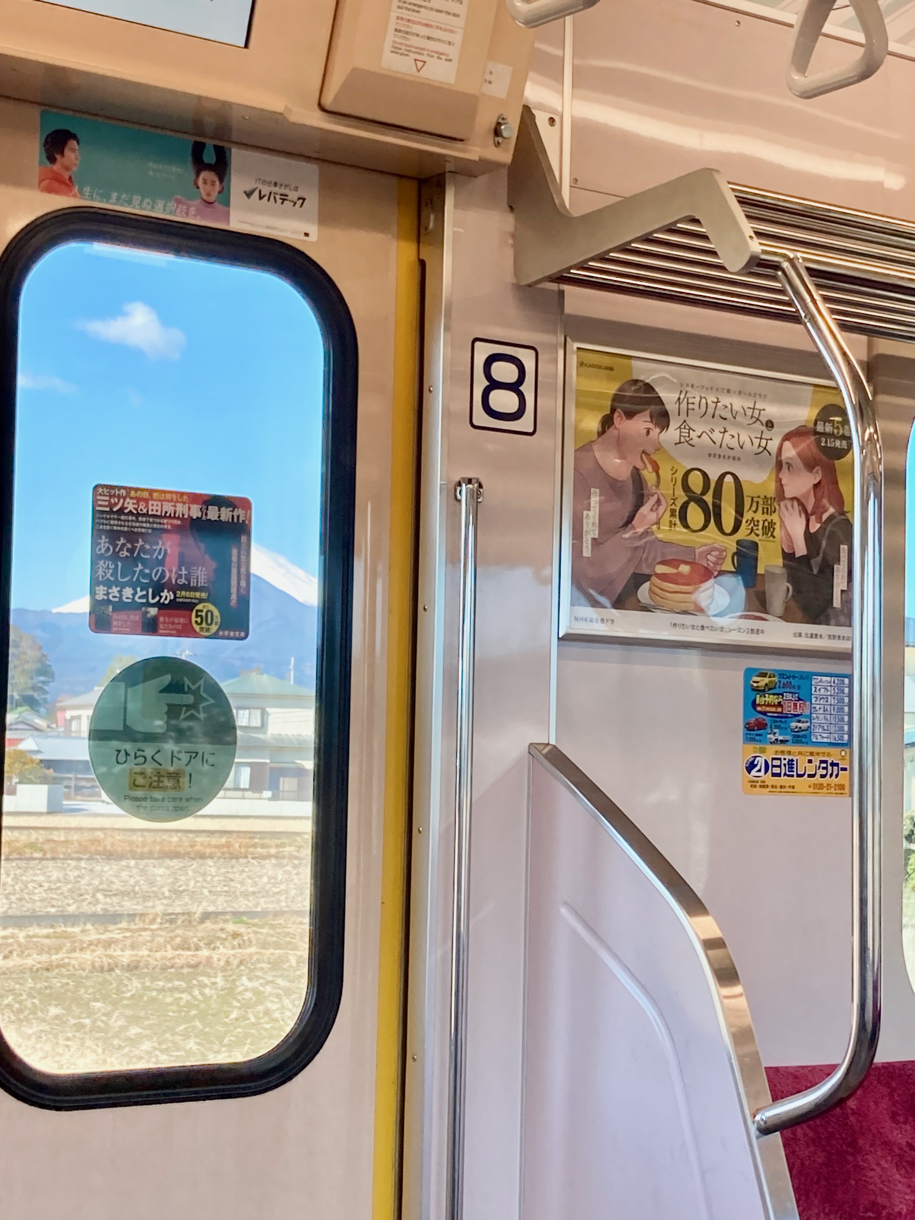 이 날은, 연휴 마지막날답게 정말이지 하루 종일 봄날씨처럼 포근하고 쨍하게 맑은 하늘을 자랑했습니다. 아타미로 향하는 전철 안에서, 아름다운 후지산도 슬쩍 구경할 수 있었고요! 사진은 좀 아쉬운 각도로 찍히긴 했지만요. 하하. 1월 초에 신칸센에서 본 후지산은 눈이 군데군데 쌓여 있는 모양새였던것 같은데, 며칠 전에 도쿄 도내에도 새하얗게 눈이 내렸던 것처럼 전체가 새하얗더라고요.