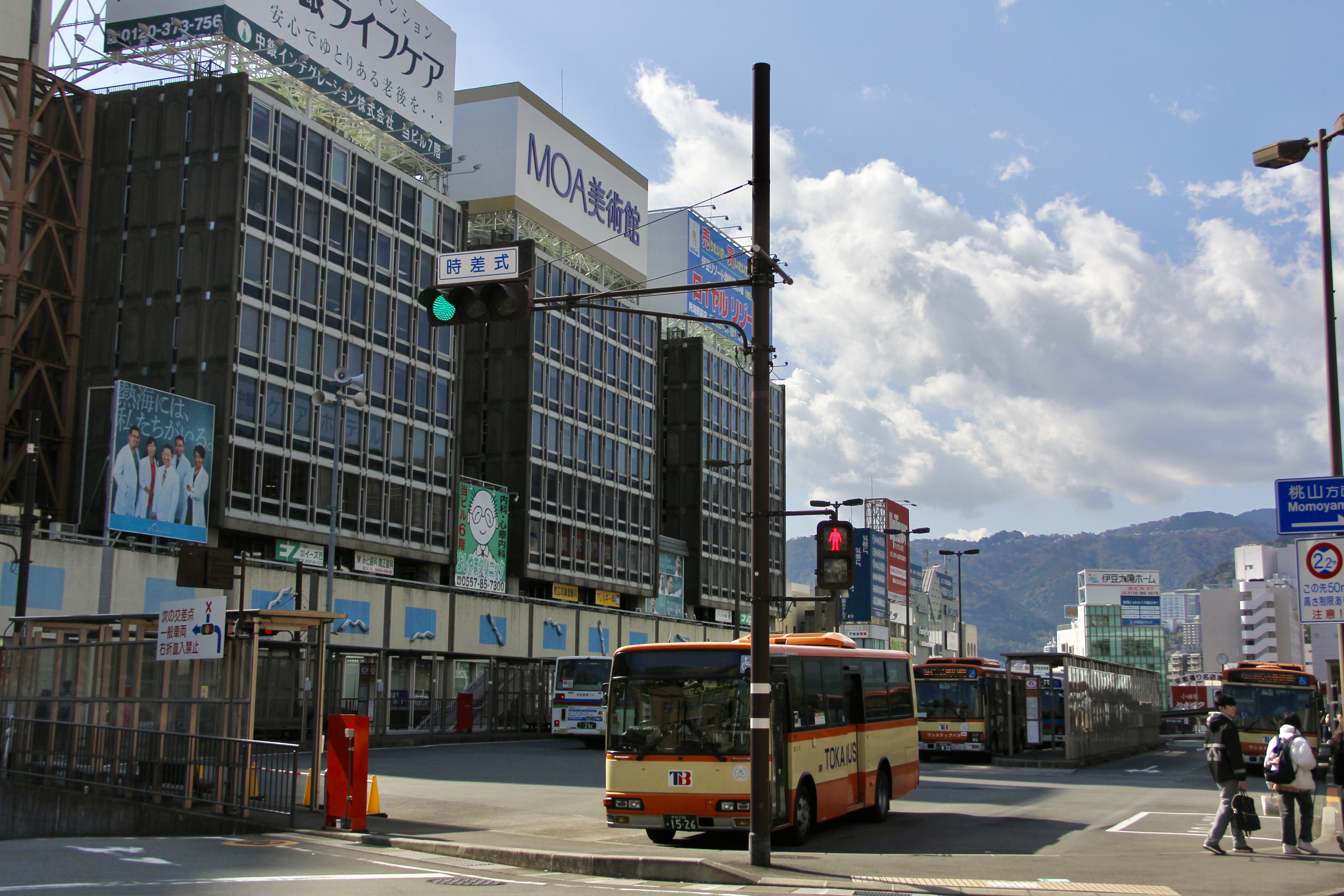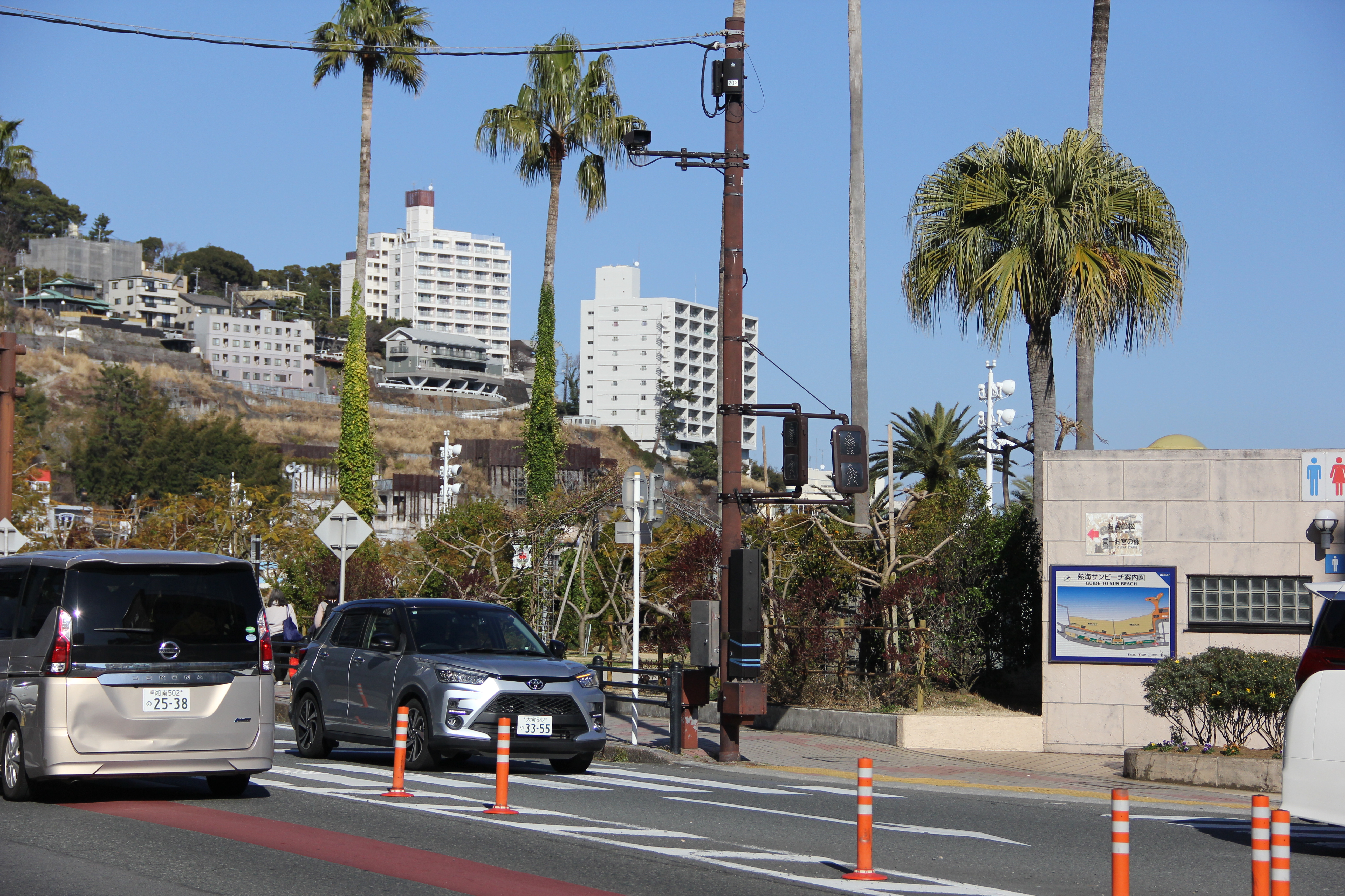 아타미 역 앞에서 버스를 내려, 아타미 선비치와 상점가가 있는 곳을 향해 10분 정도 걸어갔습니다. 그다지 먼 거리가 아니고 주변 구경도 할 겸 날씨도 좋아 충분히 걸을만 하더라고요. 저쪽 높은 곳으로 아타미성이 보입니다.