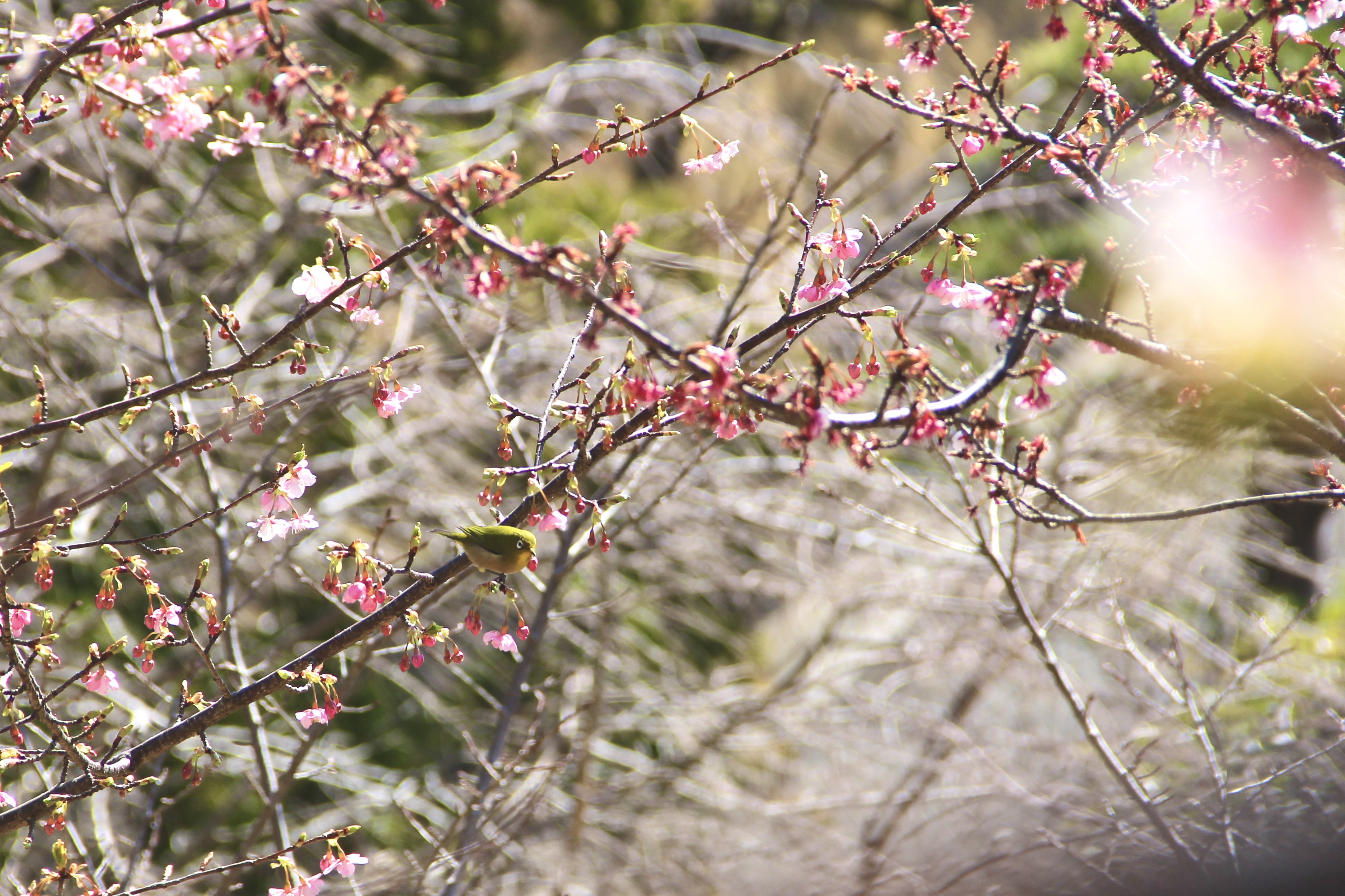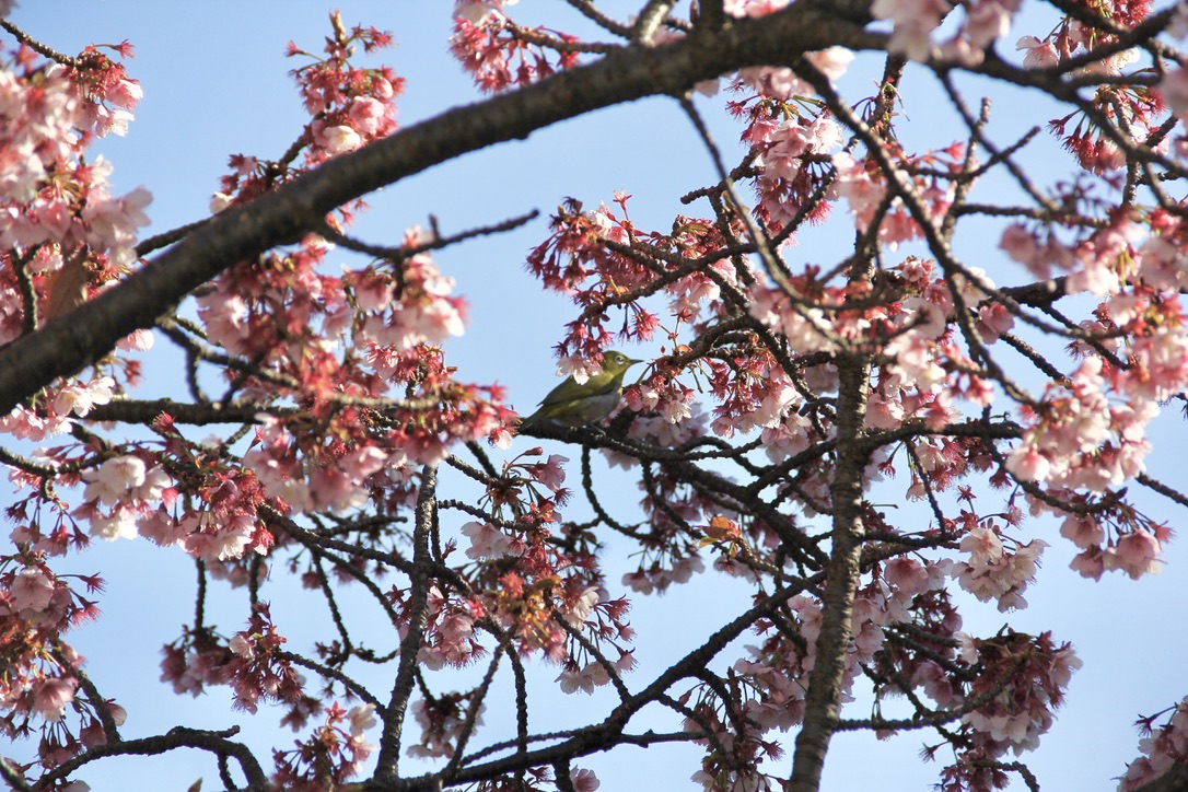 그러고보니, 벚꽃나무에 앉은 새도 구경했습니다! メジロ, 동박새라는 새인데 연둣빛 몸통이 제법 귀엽죠? 눈 주변이 하얀 색이라 일본어로는 メジロ, 하얀 눈이라고 부른다고 합니다. 핑크빛 벚꽃과 연둣빛 새가 너무 잘 어울려서 그야말로 봄이 다가온걸 온몸으로 알려주고 있는듯 해요. 자세히 보시면, 입에 벚꽃 꽃봉오리를 물고 있답니다. 아마 똑 따서 꿀을 쪽 빨아먹고 있는 중인것 같아요.