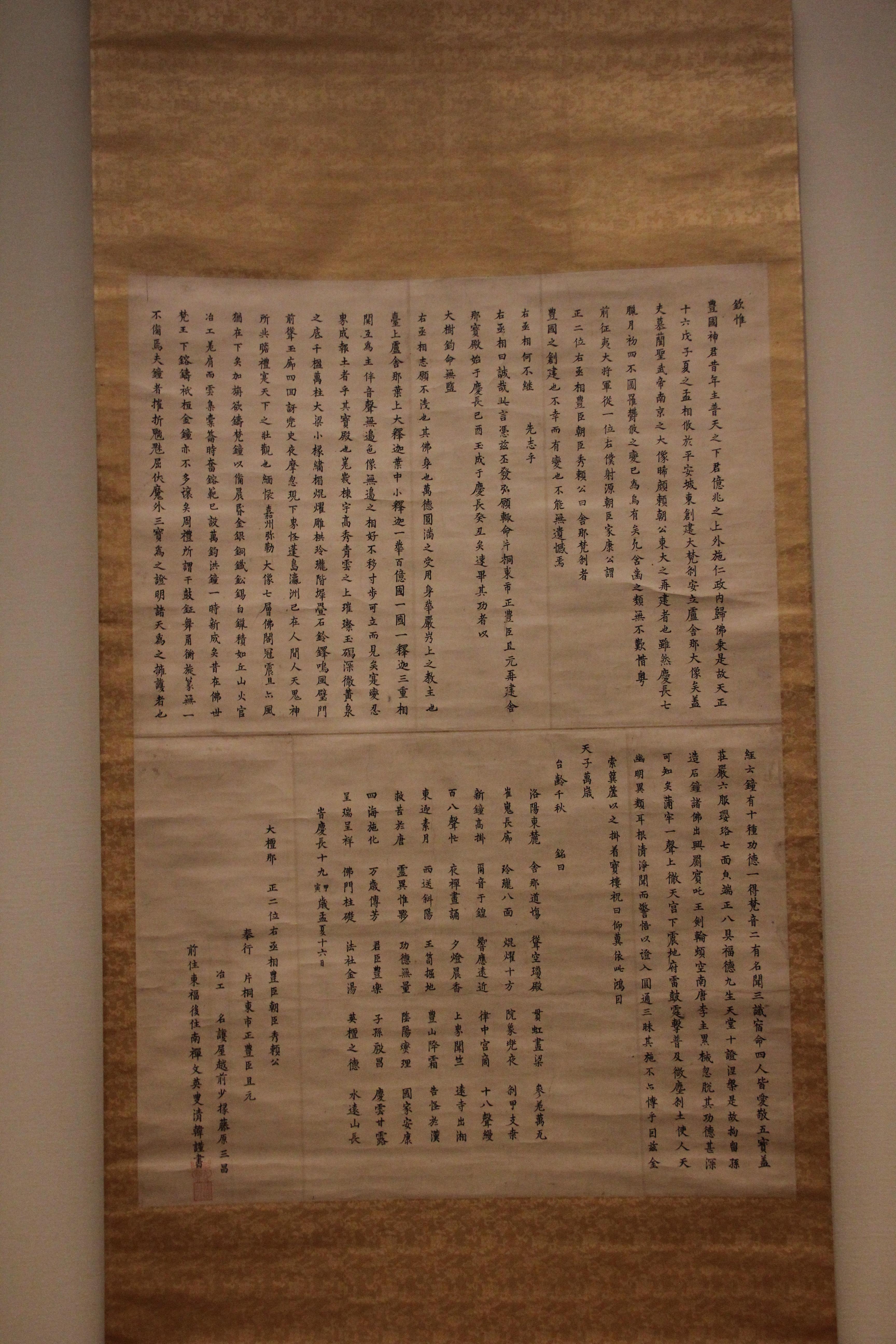19세기 모모야마 시대의 작품입니다. 이렇게 말하면 안되겠지만, 마치 디지털 인쇄라도 한 것처럼 또렷하고 명확하고 깔끔한 정자체의 글씨입니다. 아름다워요. 역시, '정자'로 글씨를 쓰는 것은 불교 관련 의식용 문서에 한정되는것 같네요. 불경을 필사하는 것이 가장 그 대표적인 예시이고요. 동시대에 이렇듯, 목적에 따라 글씨체를 다른 식으로 표현했다는건 무척이나 흥미롭습니다.