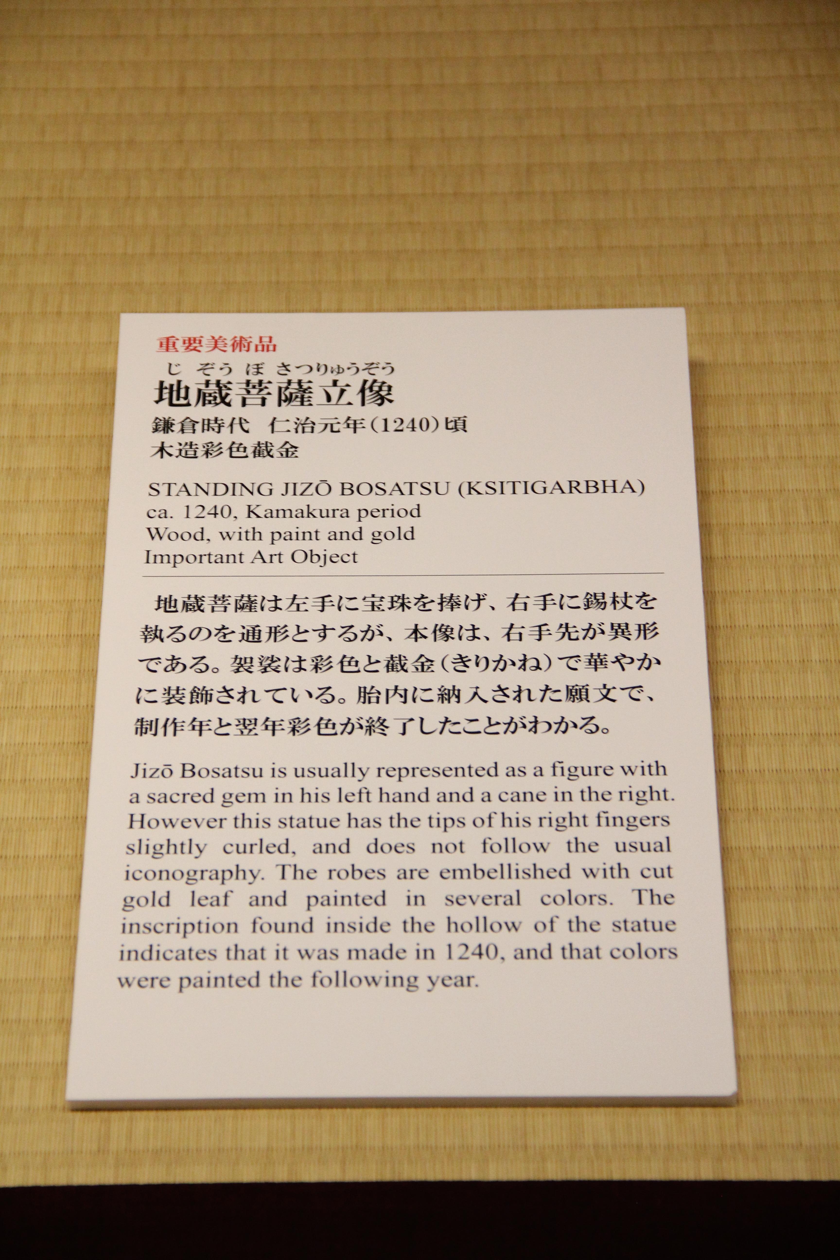 가마쿠라 시대 1240년 즈음의 地蔵菩薩立像입니다. 지장 보살은 중생들을 구제하는 역할을 합니다.