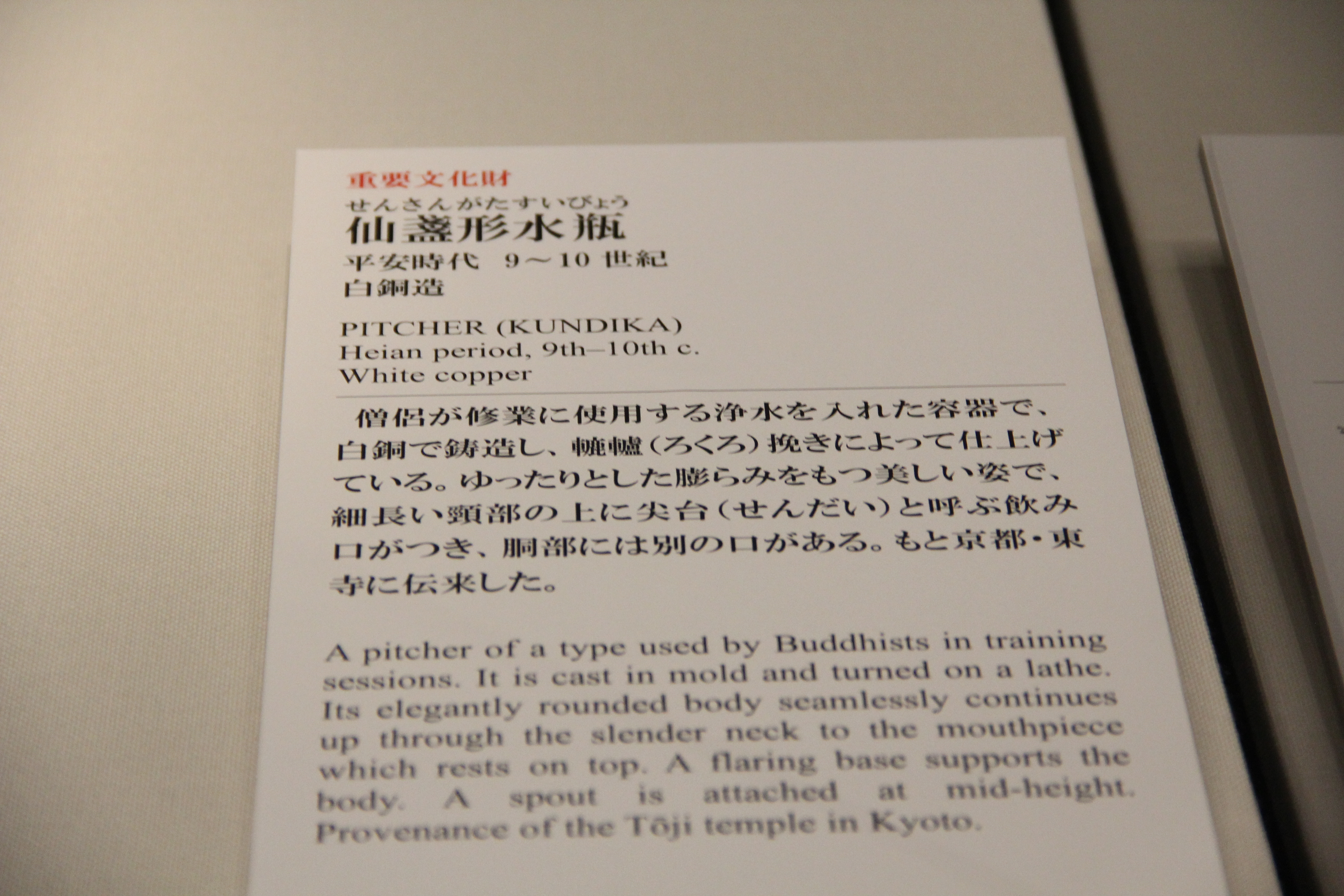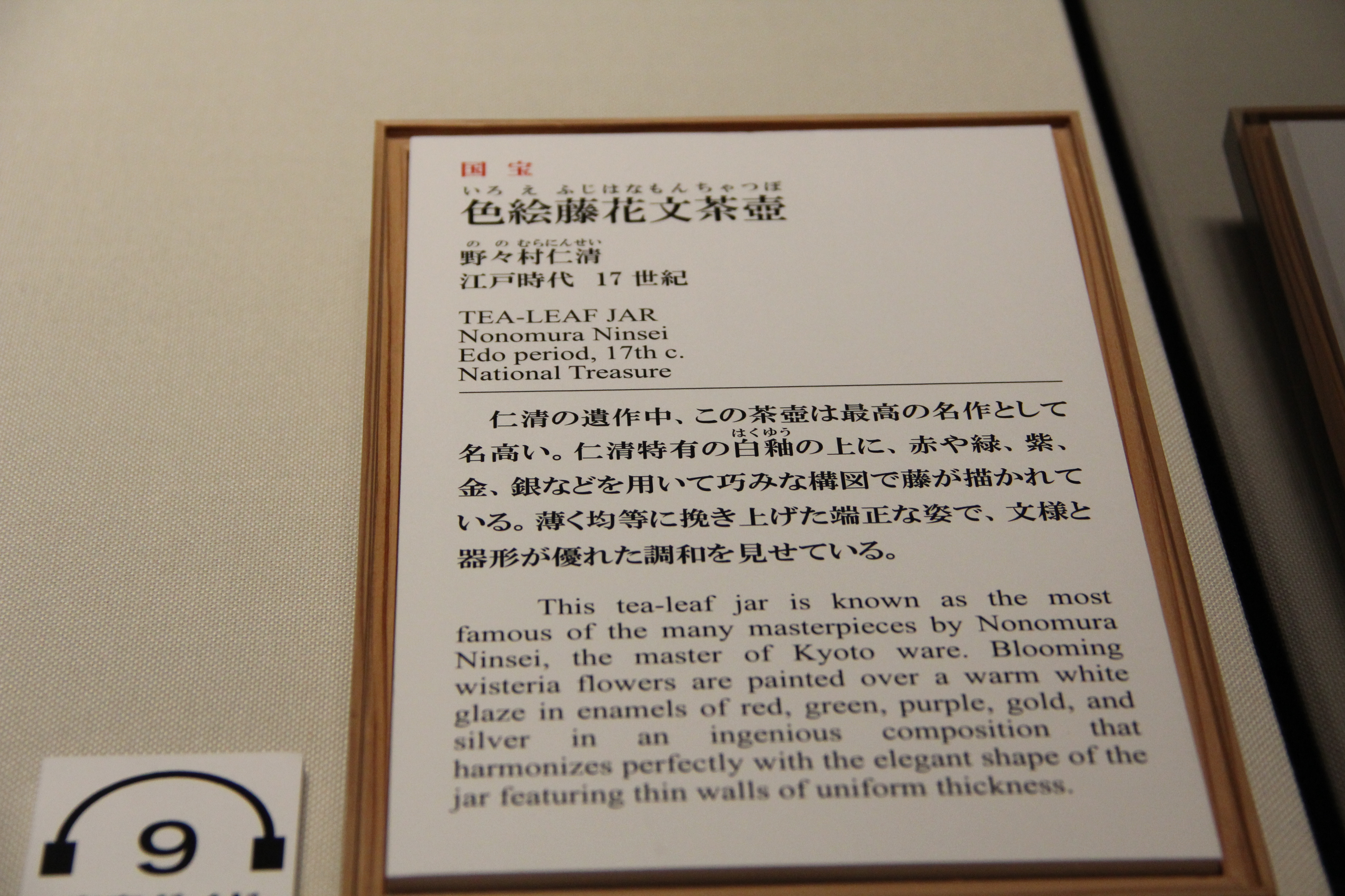 이게 바로 첫번째 국보 작품, 에도시대 17세기의 色絵藤花文茶壺입니다. 색이 무척이나 아름다웠어요. 그러고보니, 이 작품이야말로 가벽으로 전시실 중앙에 따로 공간을 만들어 이것만을 전시해두고 있더라고요. 정말 기개가 느껴지는(?) 전시 방식이 아닐 수 없습니다.